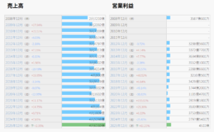 過去15年程度の売上と営業利益の推移も見ておきましょう。